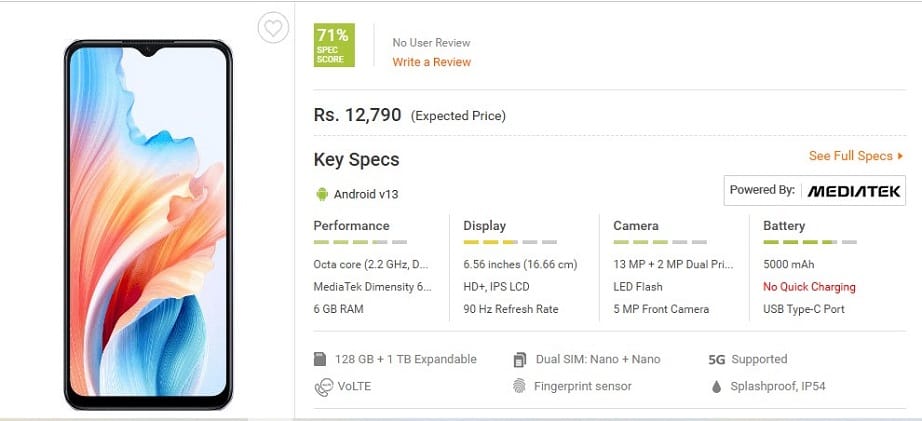 The MediaTek Dimensity 6020 chipset ensures efficient performance for multitasking, daily usage, and light gaming. Android 13 with ColorOS 13.1 provides a clean and customizable user experience.